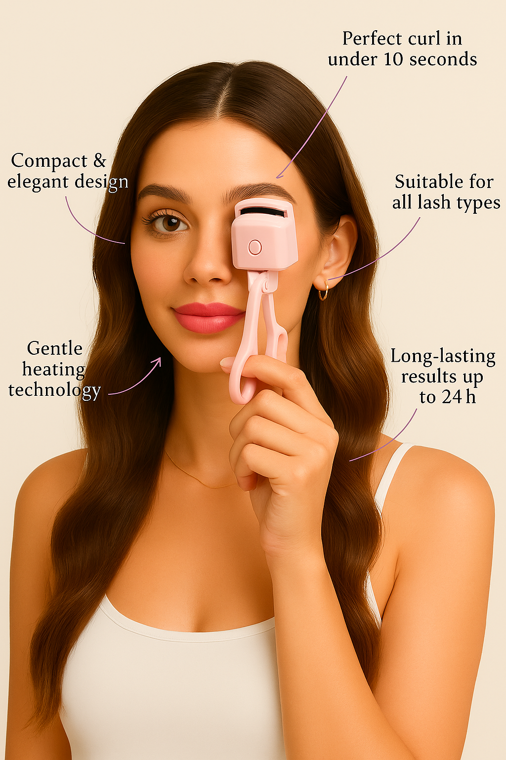 Première étape : Sur une peau propre et démaquillée, utilisez le recourbe-cils chauffant. (Ne pas coller à la base de l'oeil).
